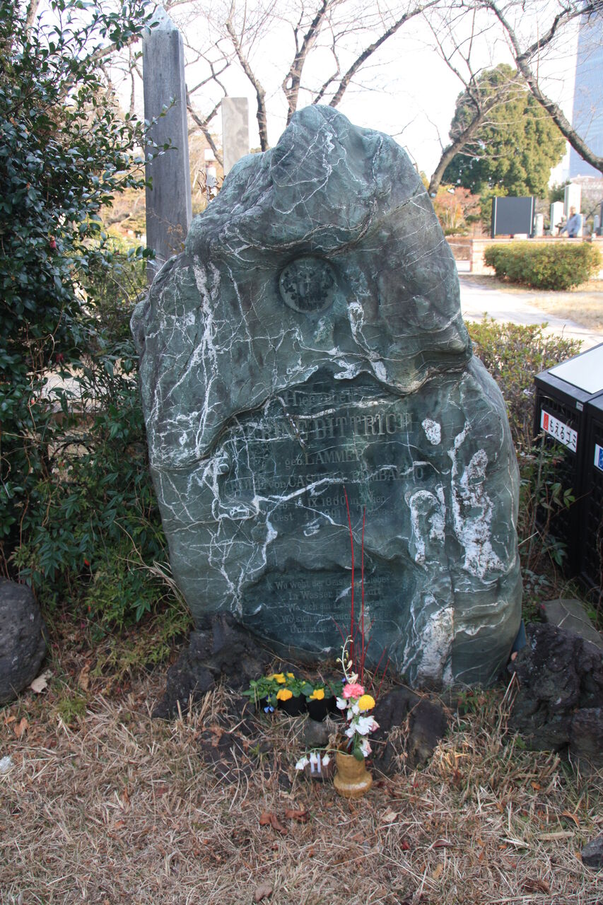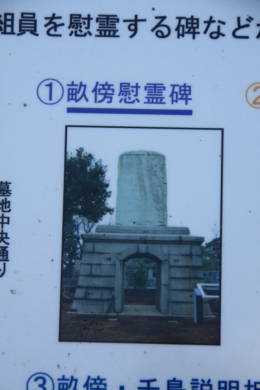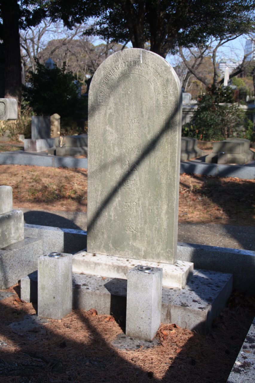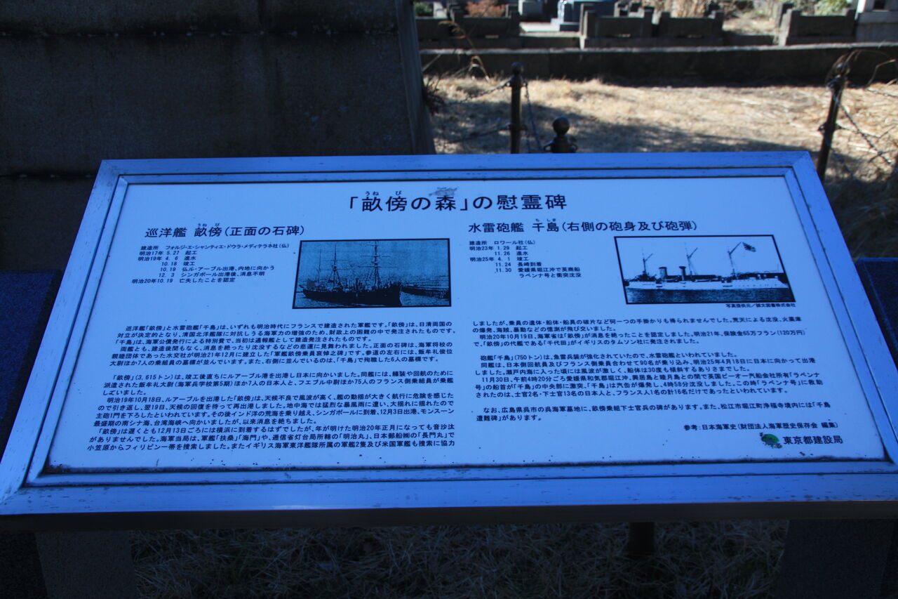 正面の石碑は、海軍将校の親睦団体であった水交社が明治 21年 12月に建立した「軍艦畝傍乗員哀悼之碑」です。
