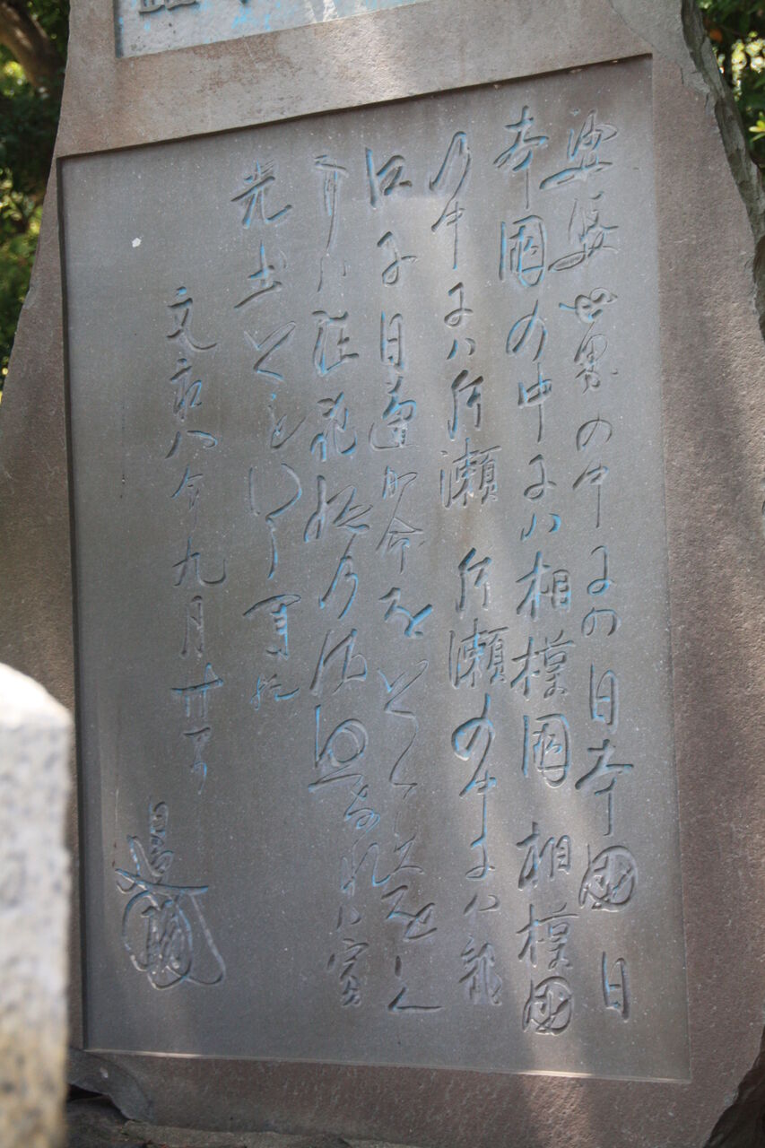 その昔、日本武尊(やまとたけるのみこと)の東征のおり、三浦半島から房総へ渡るとき、大暴風雨に会い、妃(きさき)の弟橘(おとたちばな)姫が身を海に投げて海神を鎮め、尊の一行を救った。
