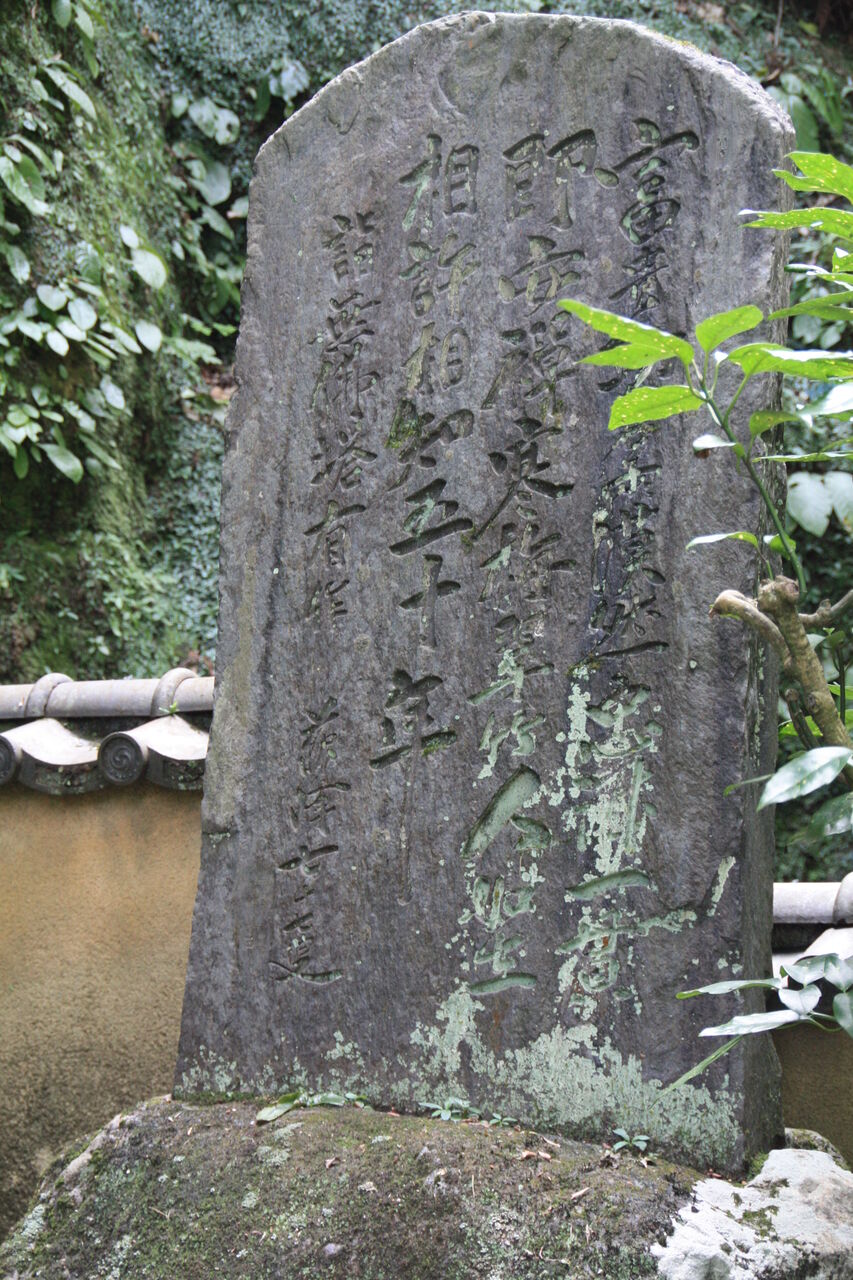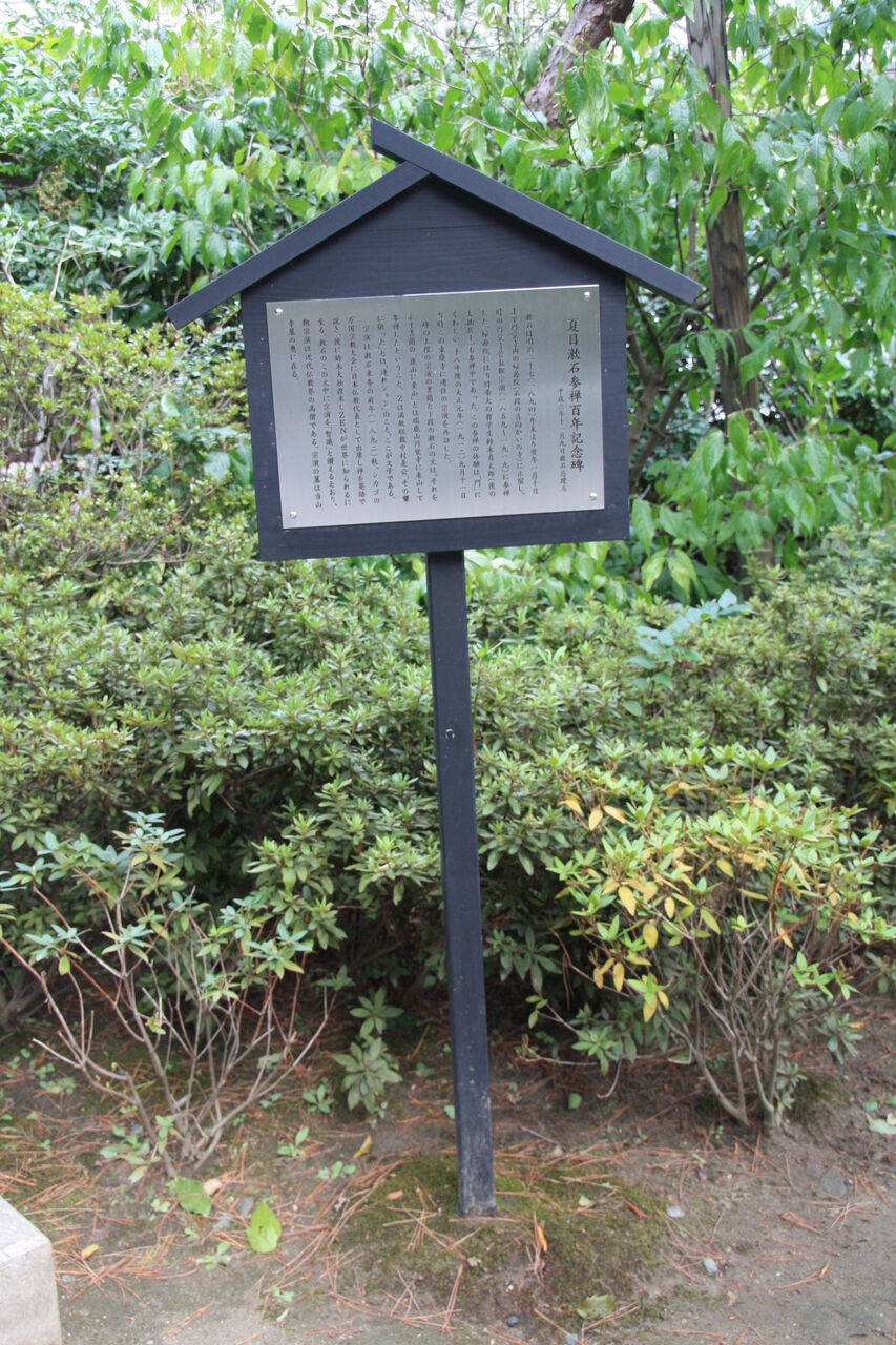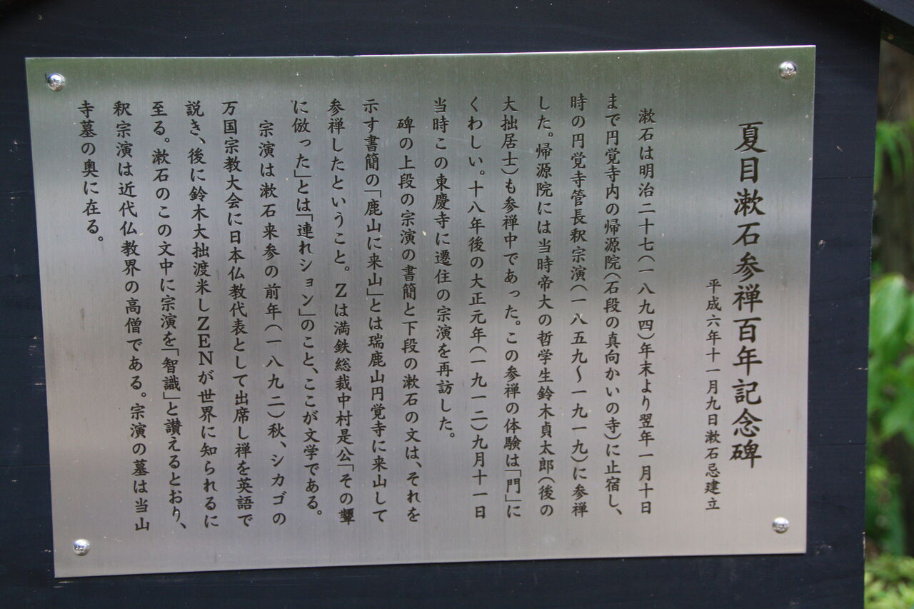 山門の石段の右下にある高さ 1メートル 23センチの碑は、平成 6年 12月に夏目漱石の参禅百年を記念して建立した記念碑。