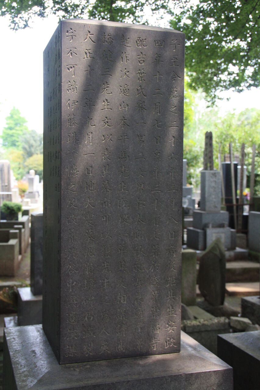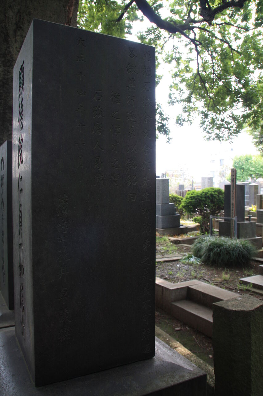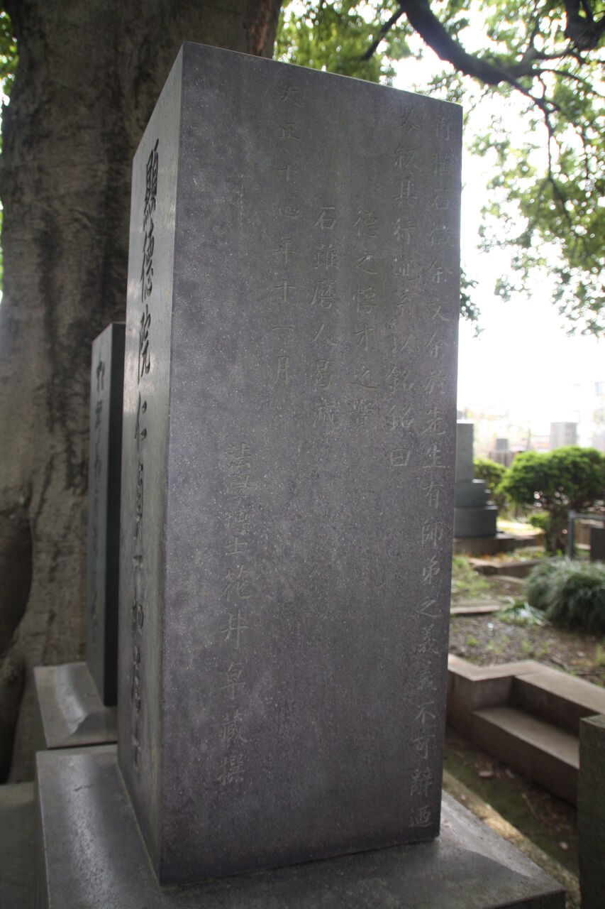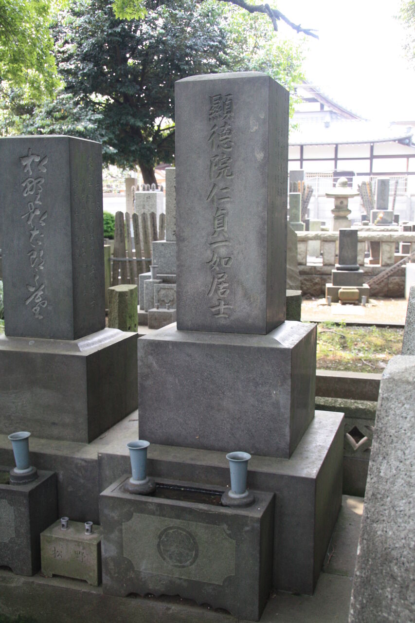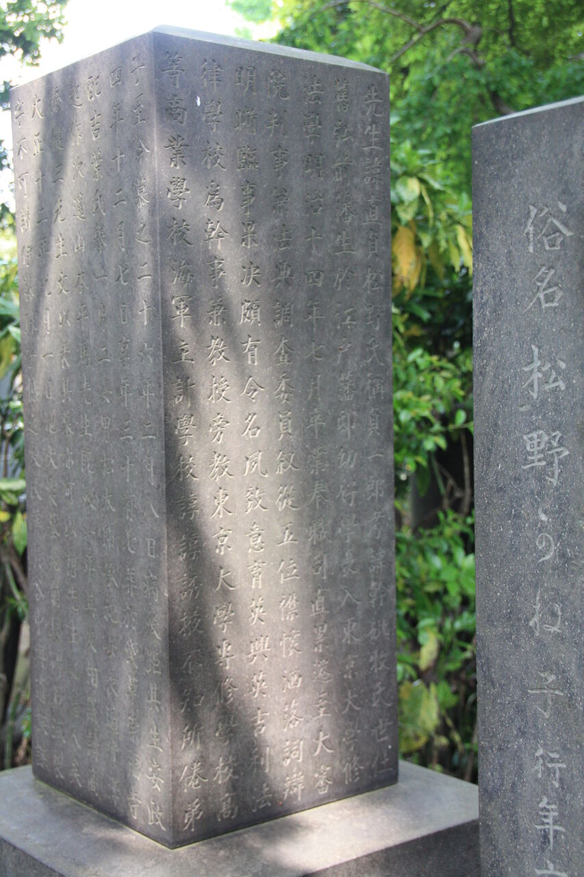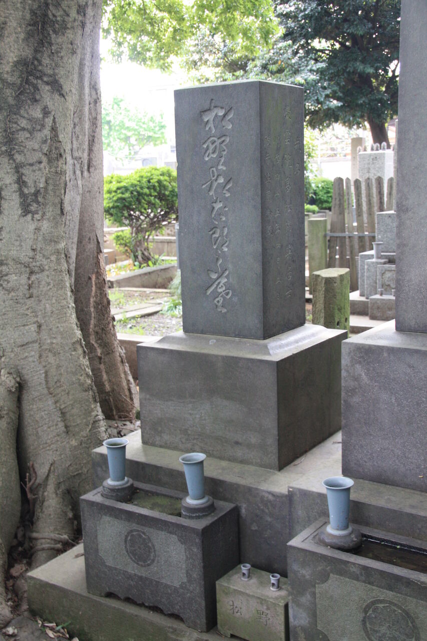 「顕徳院仁貞一如居士」。法学博士花井卓蔵撰の略歴あり。左隣に子・松野松太郎墓あり。