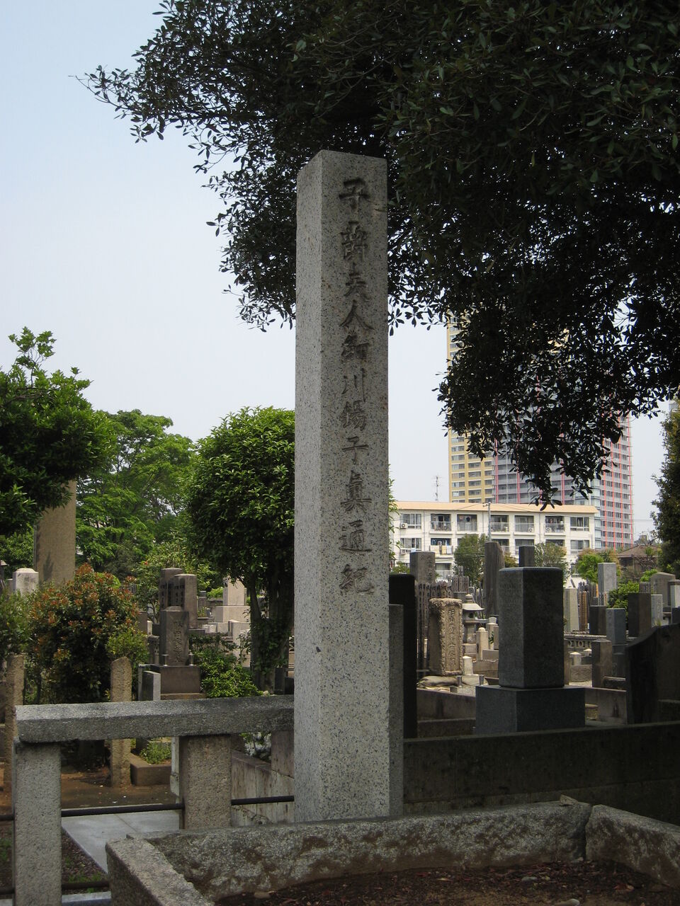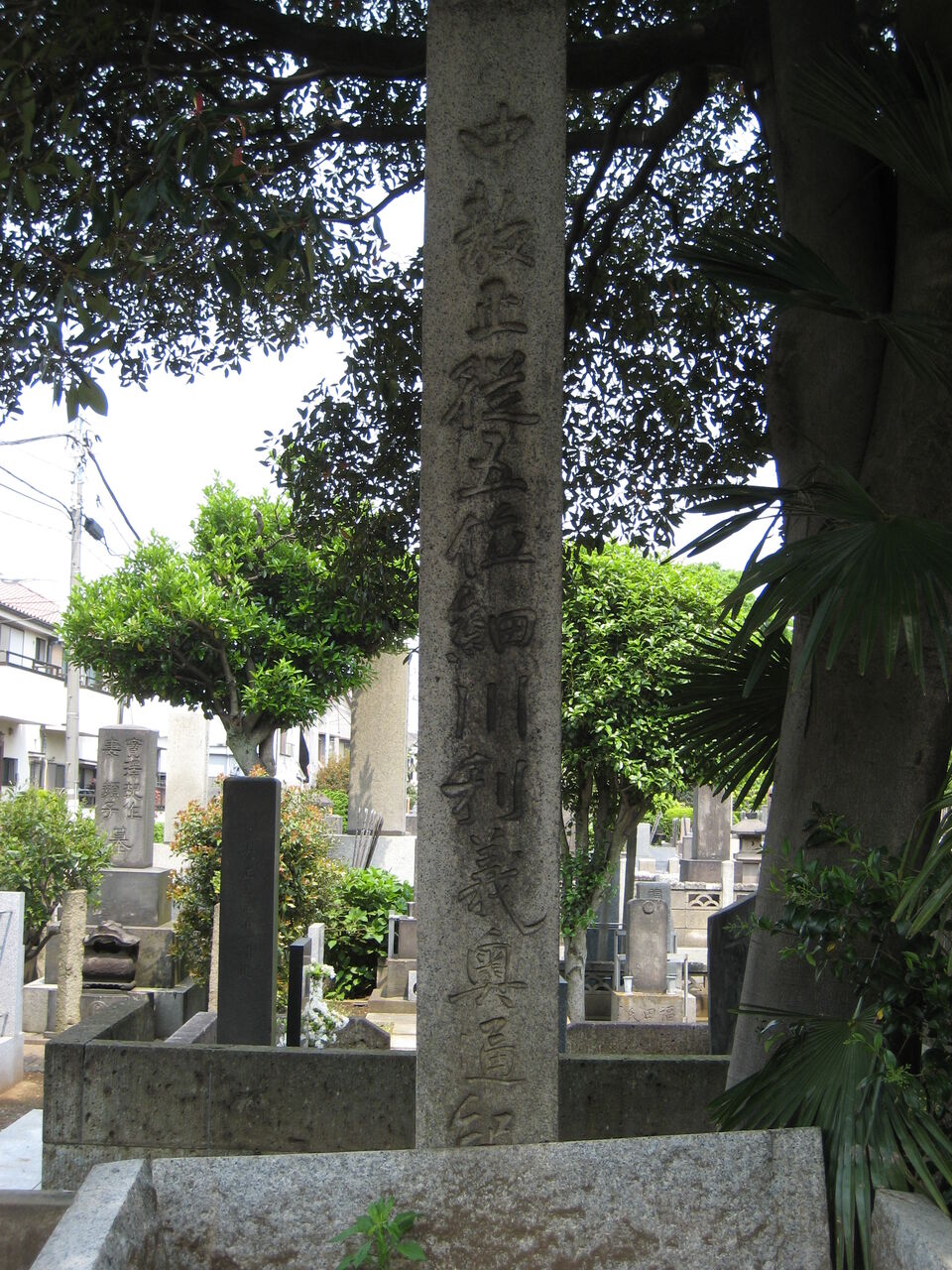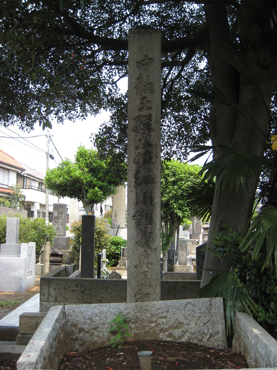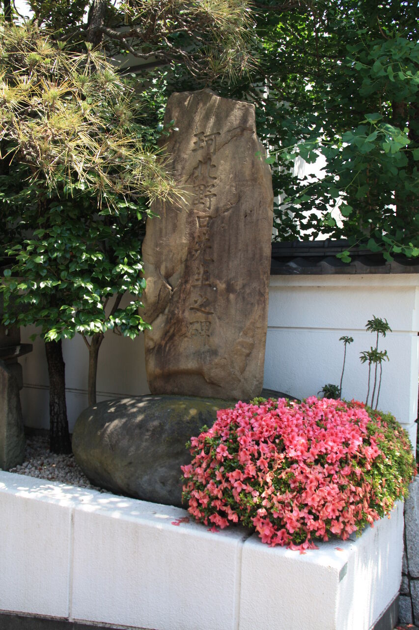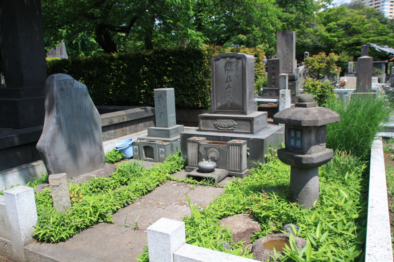「顕徳院仁貞一如居士」。法学博士花井卓蔵撰の略歴あり。左隣に子・松野松太郎墓あり。
