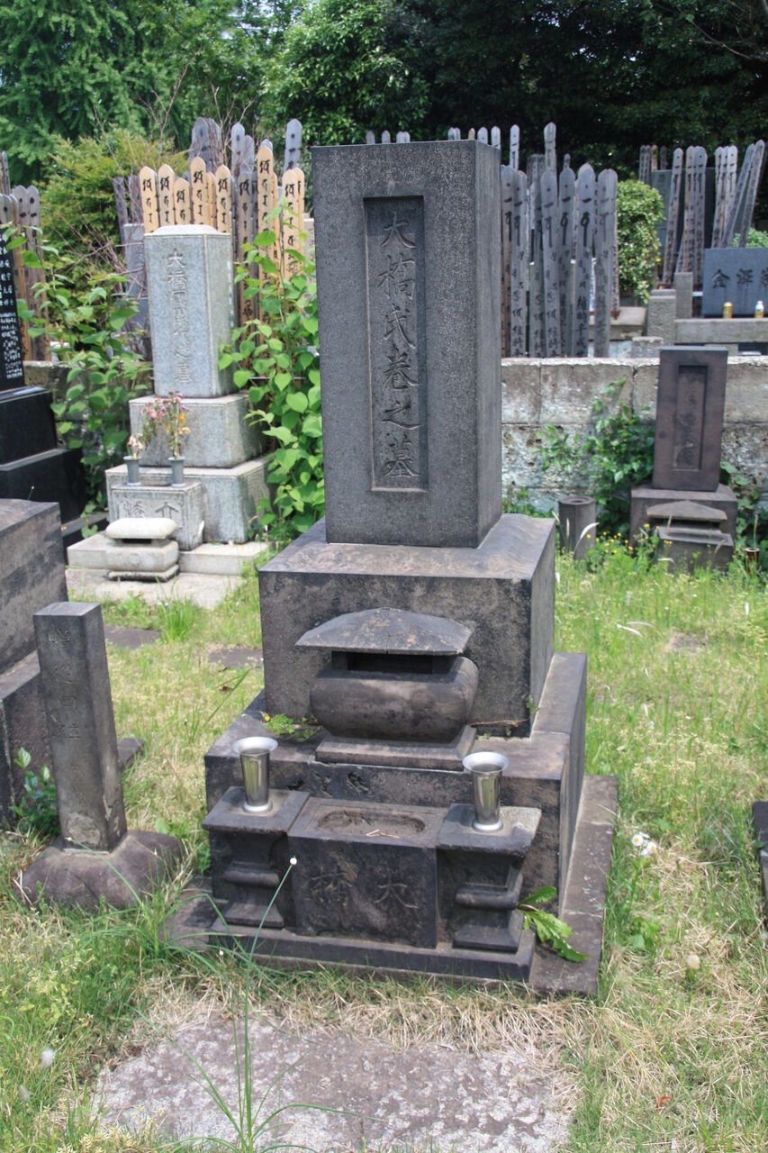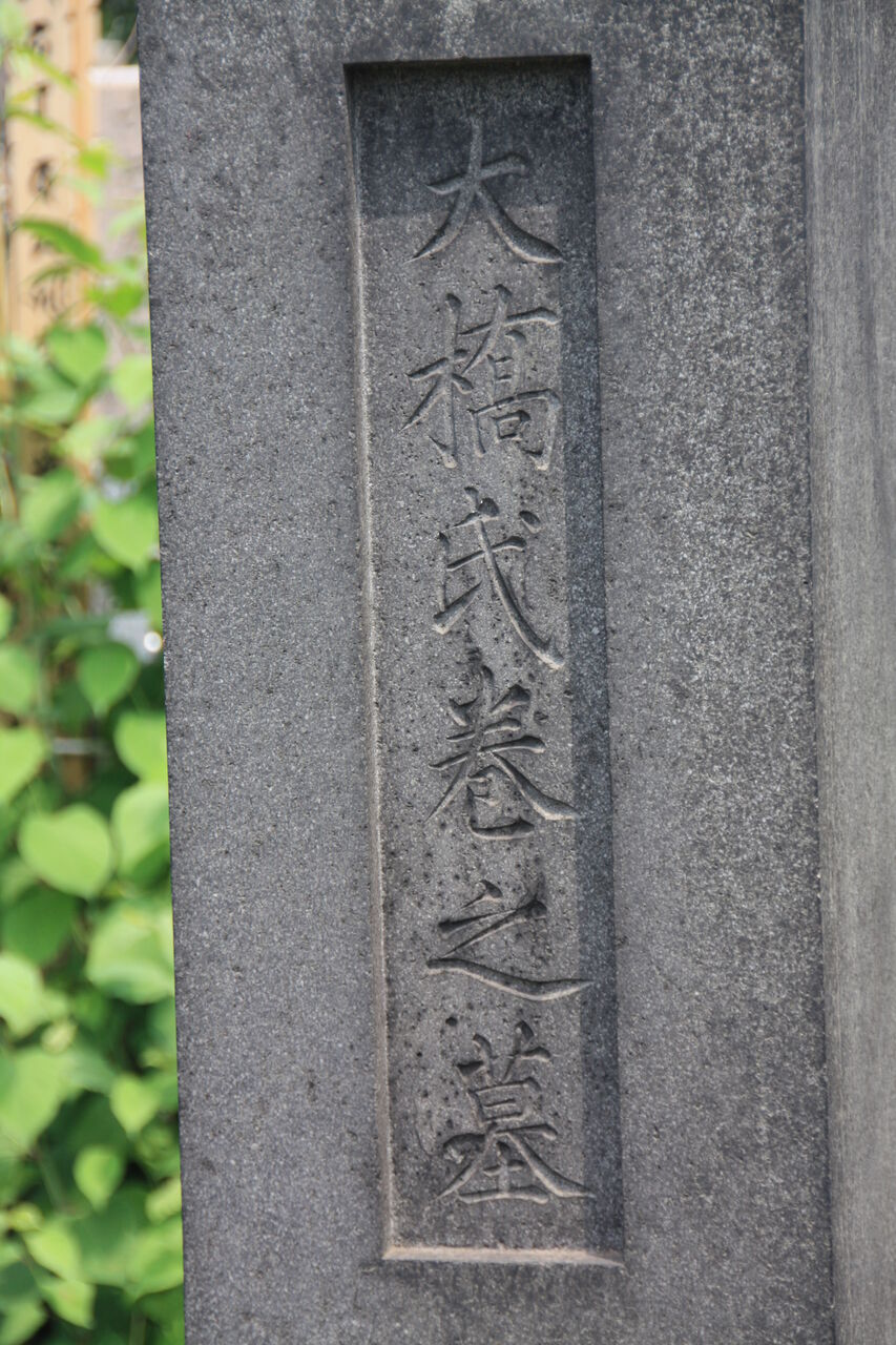 正面「大橋氏巻之墓」。「貞荘懐之大姉」。のちの人は、その功績を賞して「貞荘孺人」という。