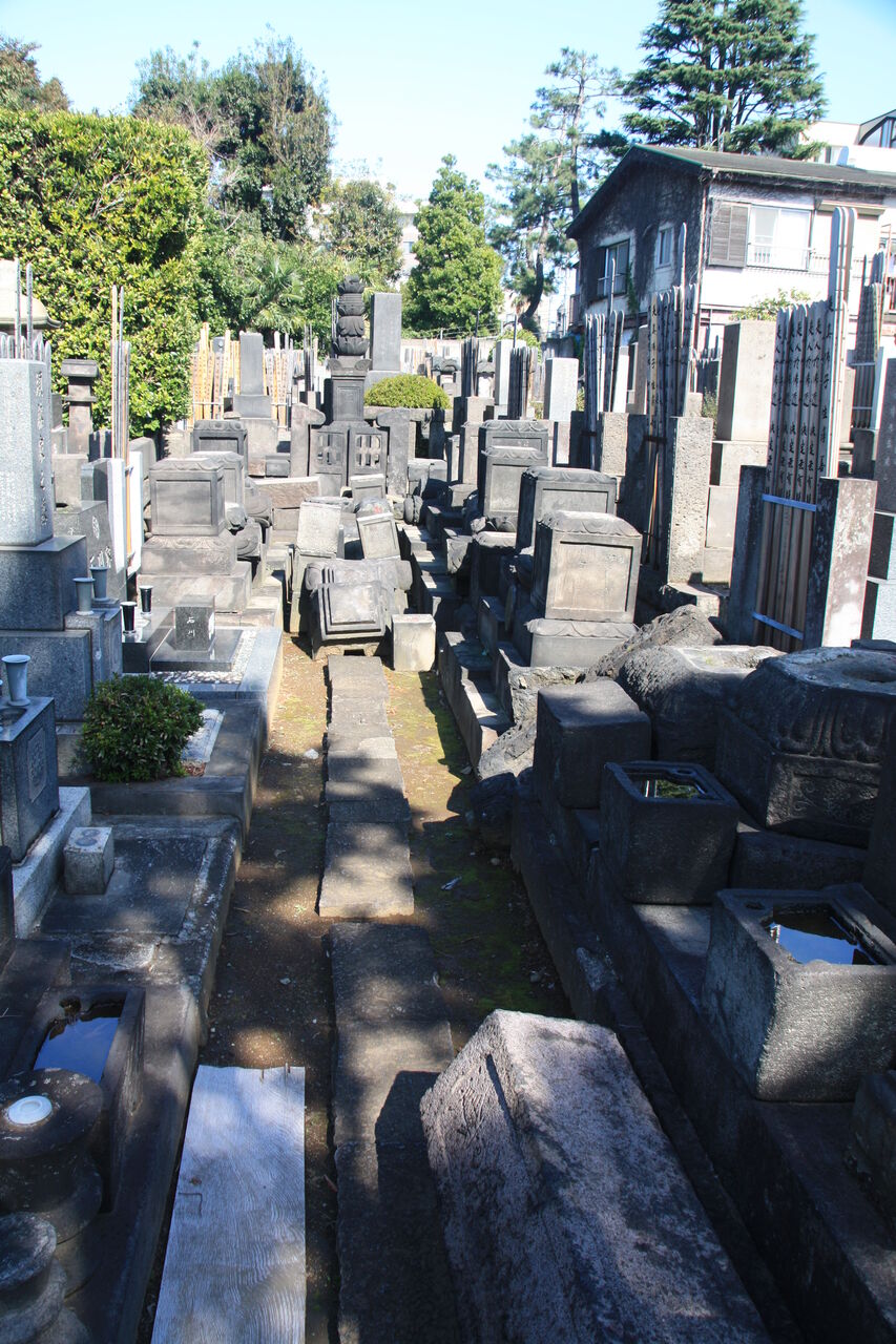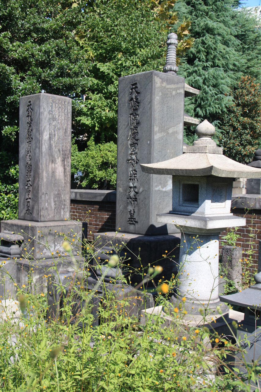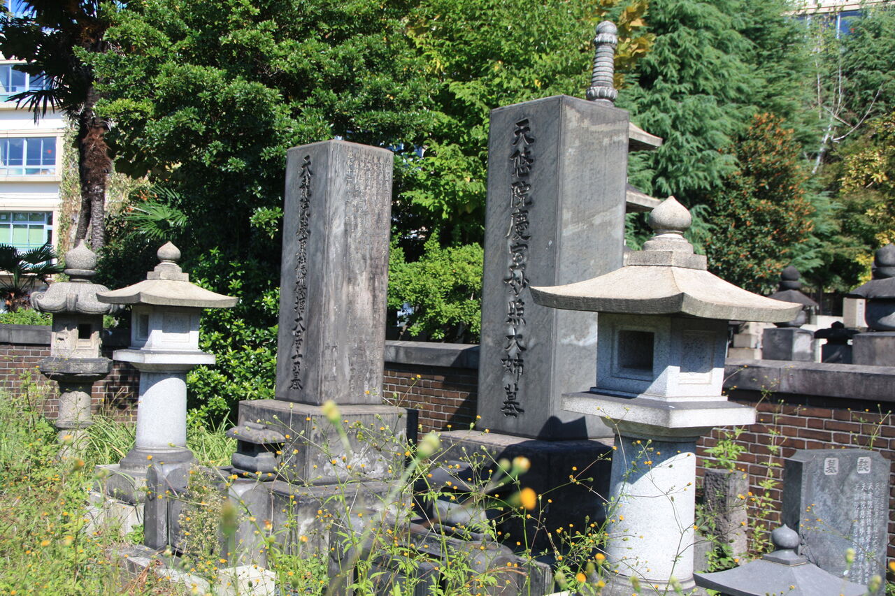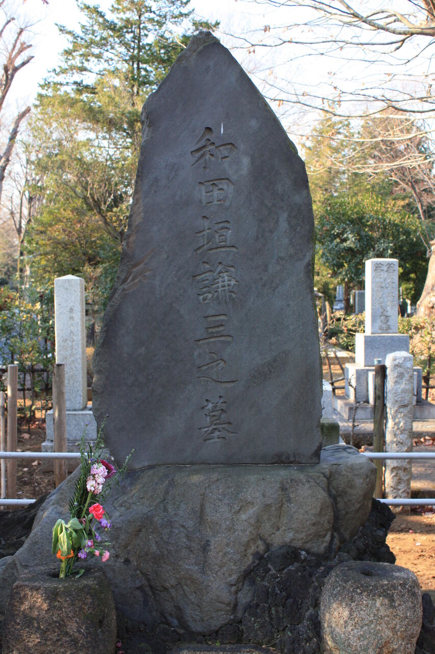 生垣の奥、神殿の横に御堀耕助の墓があります。