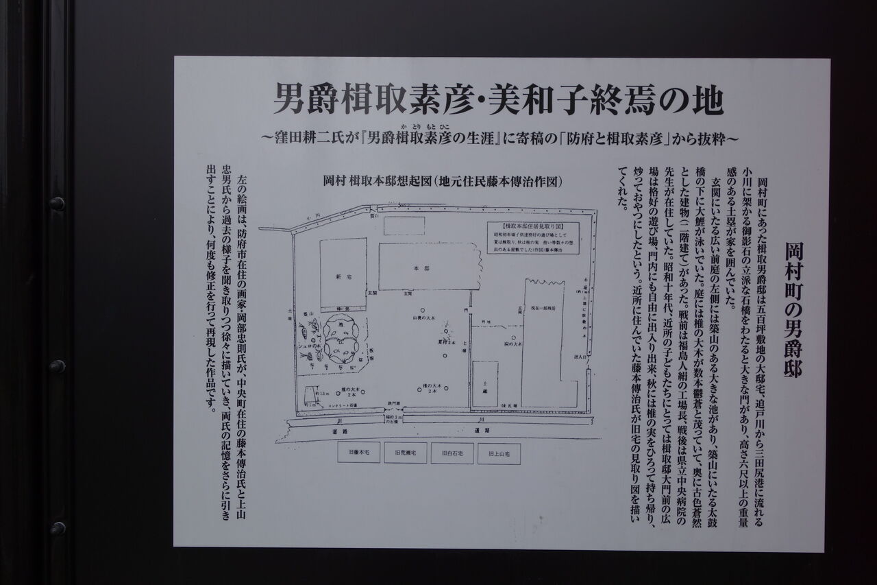 岡村町にあった楫取男爵邸は五百坪敷地の大邸宅、迫戸川から三田尻港に流れる小川に架かる御影石の立派な石橋をわたると大きな門があり、高さ六尺以上の重量感のある土塁が家を囲んでいた。