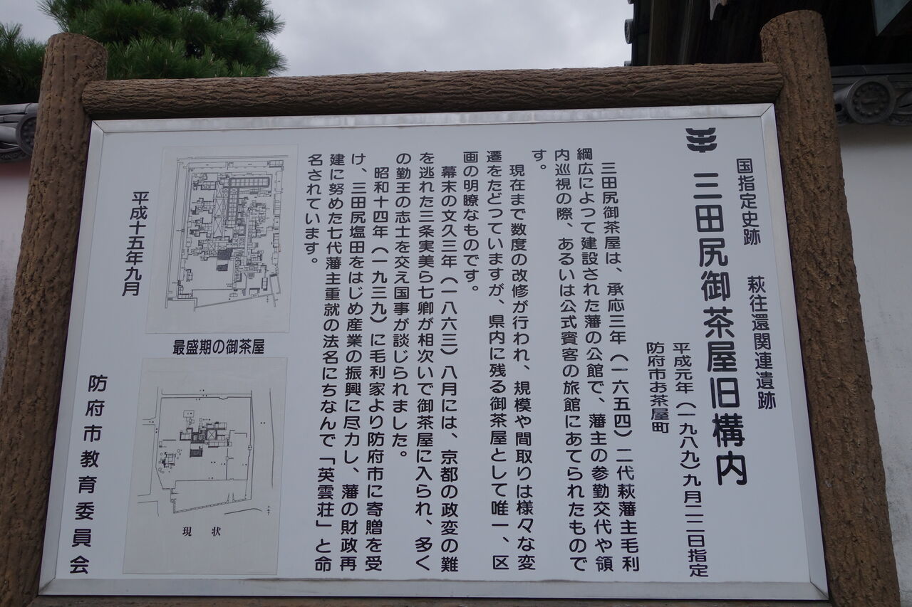 三田尻御茶屋は、承応三年( 1654 )二代萩藩主・毛利綱広によって建設された藩の公館で、藩主の参勤交代や領内巡視の際、あるいは公式賓客の旅館にあてられたものです。
