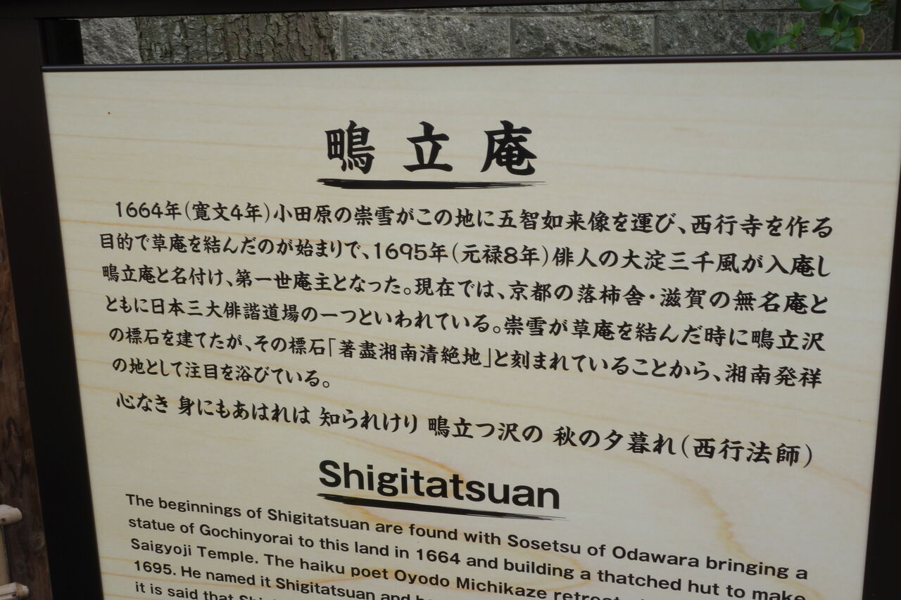「鴫立沢(しぎたつさわ、旧字体表記:鴫立澤、古訓:しぎたつさは)」は「鴫の飛び立つ沢」を意味するだけの、ありふれた地名であったろうが、いつしかこの地は西行の歌にちなんでその名で呼ばれるようになったと思われる。時を下り、伝承にあやかって江戸時代初期の寛永年間(1624-1645年間)に結ばれた「鴫立庵」が今も残る[7]。