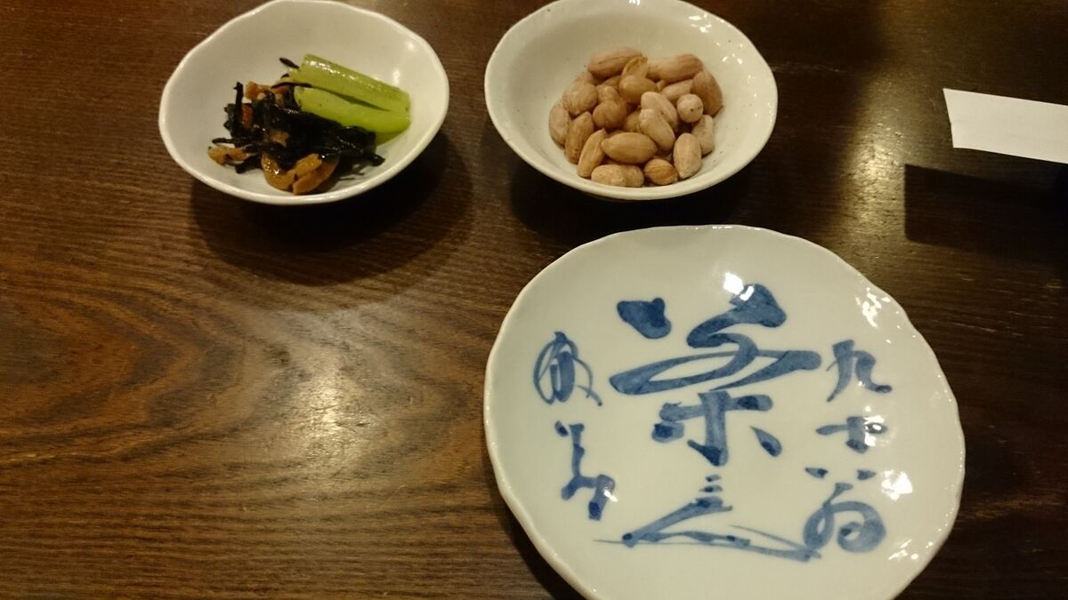 ⇧ お通しは、ひじきとさつま揚げ煮とゆで落花生