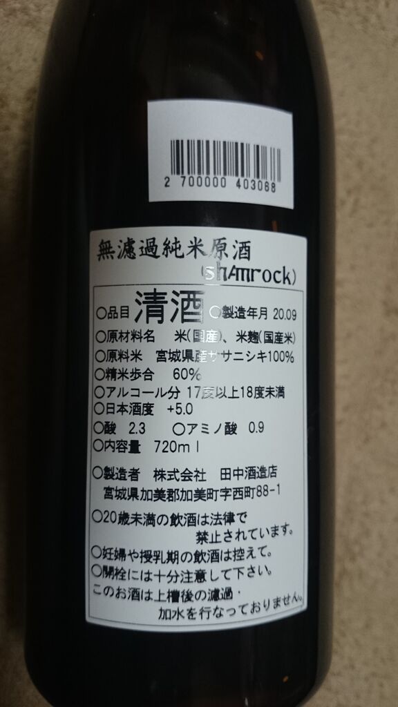 8277 田中酒造 : 無濾過純米原酒 シャムロック / shamrock