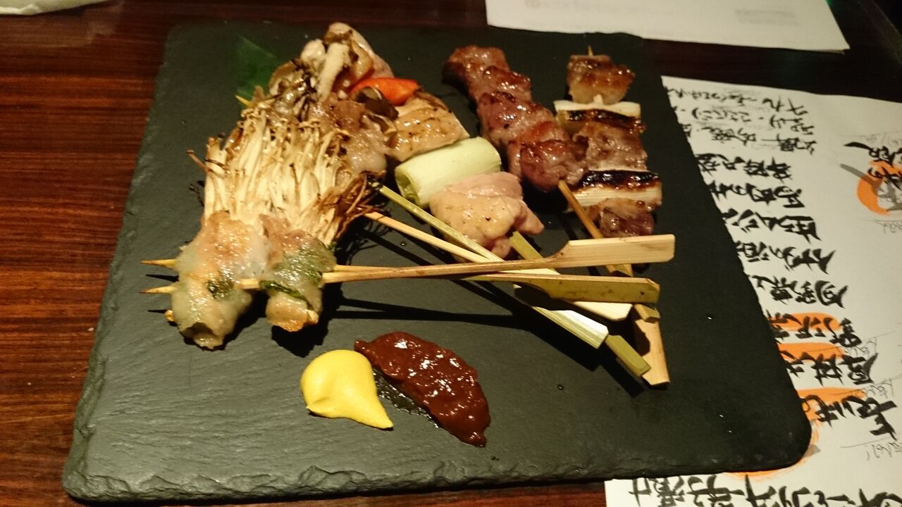 ⇧ レバー焼き ( 右 ) 、ねぎま ( 豚肉 ( 左 ))