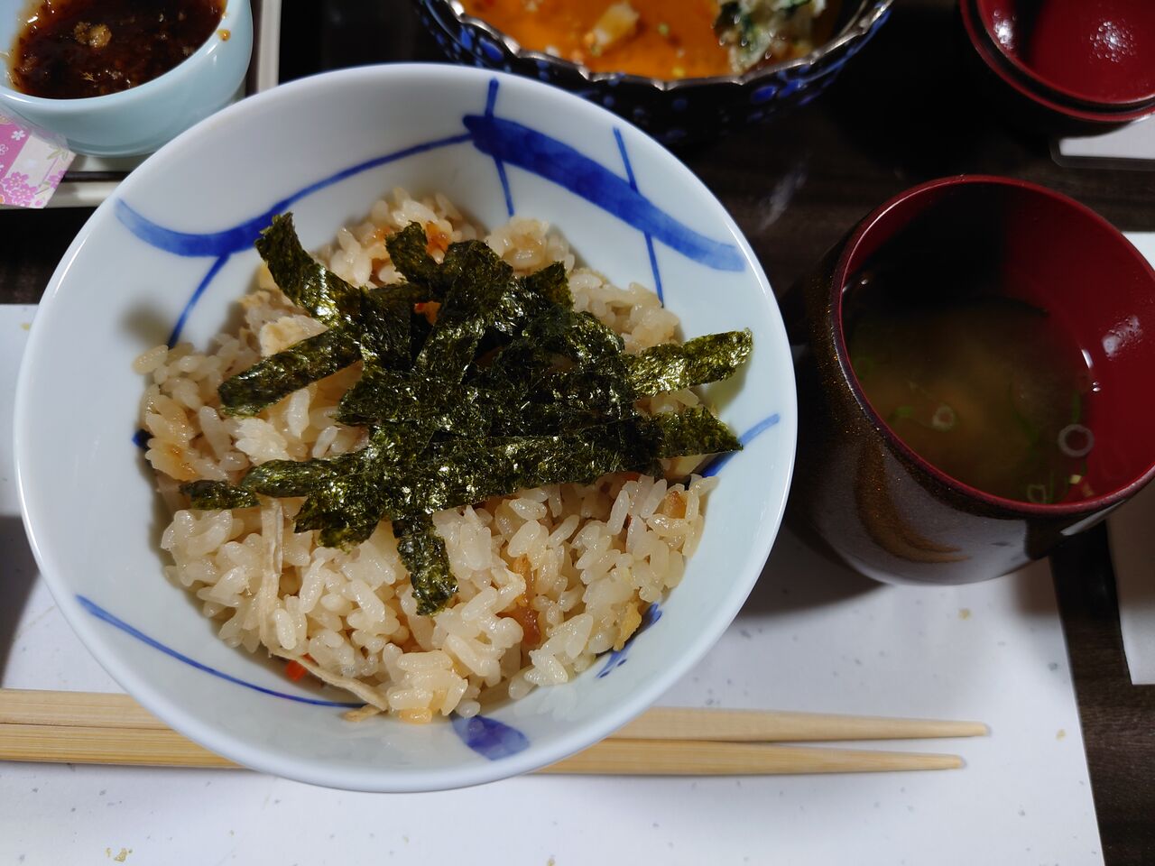 ⇧ 食事 鯛めし 「海軍料亭五月荘・名物」 止椀 鹽ますの味噌汁 「戦艦・扶桑」