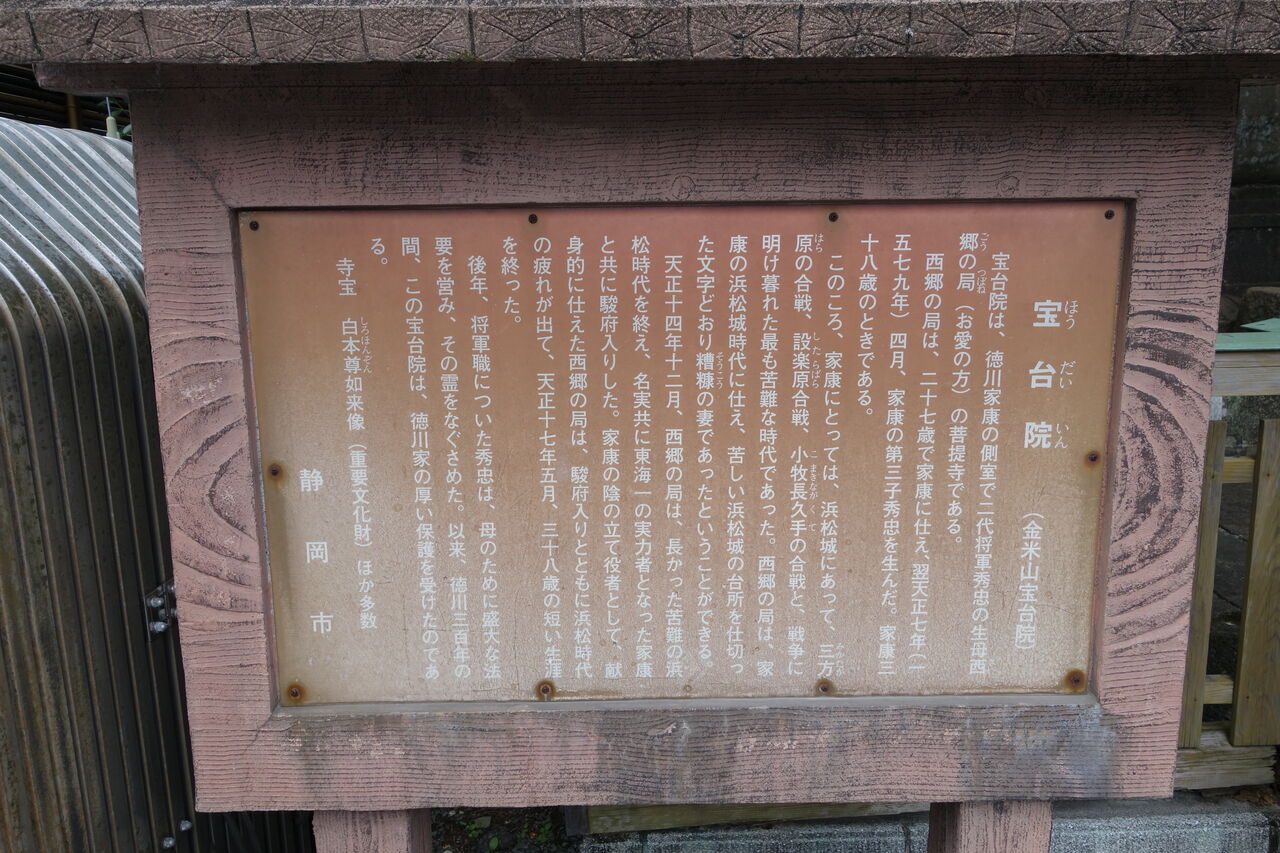 ・1628年(寛永5年)西郷の局の戒名が「宝台院殿一品大夫人松誉定樹大禅定尼」となる[2]。幕府、駿河龍泉寺を宝台院と改める[2]。増上寺とともに徳川家の菩提寺となる[3]。徳川忠長によりお江の方の墓および御霊屋造営