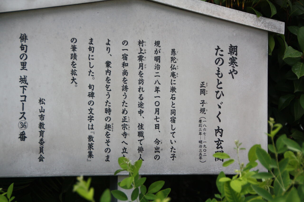 愚陀仏庵 ( ぐだぶつあん )に漱石と同宿していた子規が明治二八年一〇月七日、今出 ( いまづ ) の村上霽月 ( むらかみ - せいげつ )を訪れる途中、住職で俳人の一宿和尚を誘うため正宗寺 ( しょうしゅうじ ) へ立ちより、案内を乞うた時の趣 ( おもむき ) をそのまま句にした。