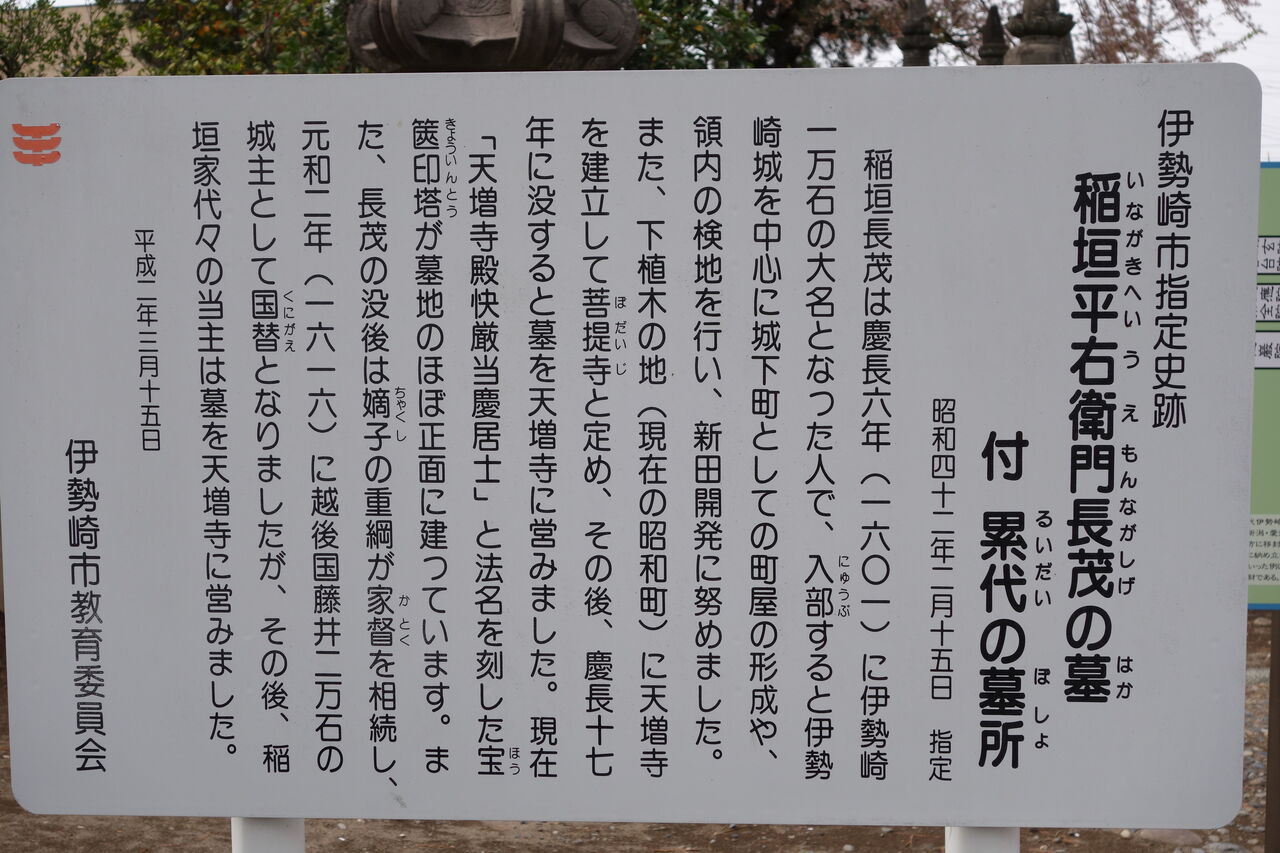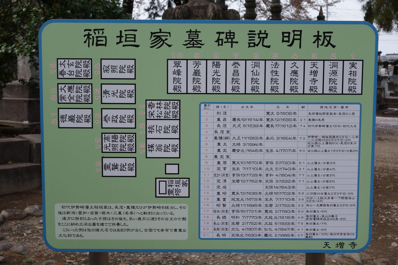また、長茂の没後は嫡子の重綱が家督を相続し、元和 2年 ( 1616 ) に越後國藤井 2万石の城主として国替になりましたが、その後、稲垣家代々の当主は墓を天増寺に営みました。