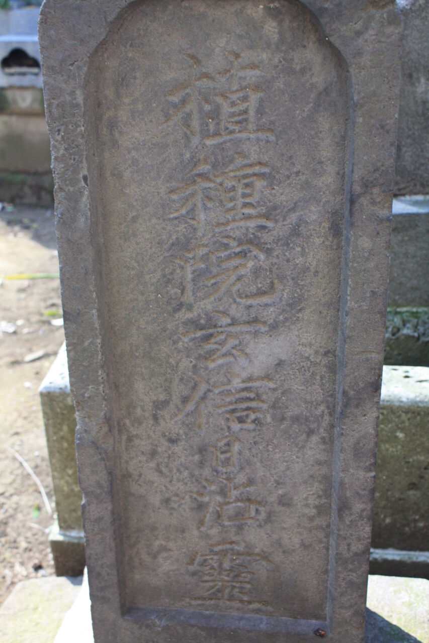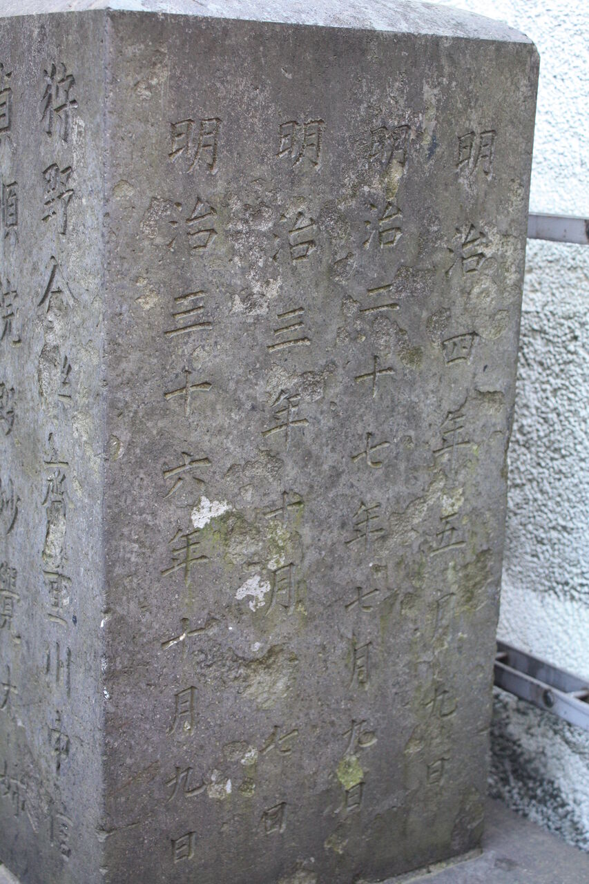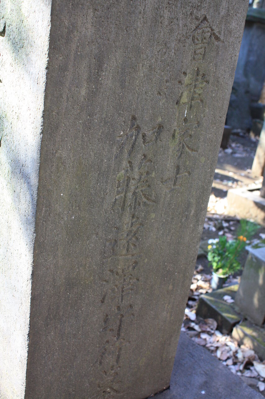 裏面には、建立者である弟子たちの名が刻まれており、その中には明治時代の浮世絵を代表する月岡芳年や新聞錦絵の落合芳幾、おもちゃ絵の歌川芳藤などがみられます。