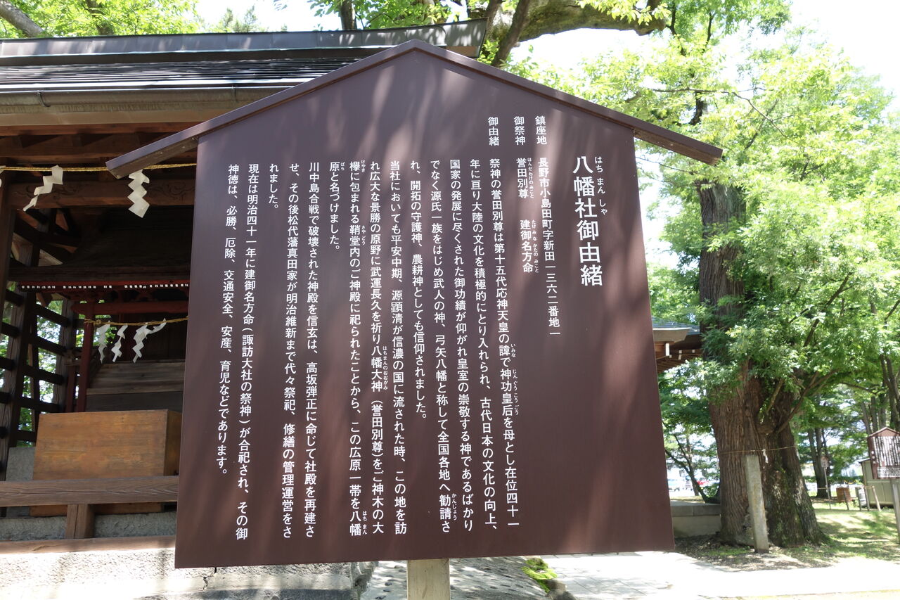 創建年代は不詳。町や長崎県のほとんどの資料等に記載されている由緒によると、「元和3年(1617年)~同5年にかけて、有川村では毎年6月17日に限って海で遊泳する大人・子供に溺死人が相次いだ。時の乙名役の高井良福右衛門に海童神からの神託によって神子島に石祠を建立し、海童神を奉祀した」と記載されている。また、「翌(元和)6年6月17日には例祭を行い、二〇加踊り(にわかおどり)と呼ばれる即興の寸劇を奉納したところ、溺死者はなくなった」とされる。その後も二〇加(俄)の奉納は毎年行われ、現在では有川地区の年中行事である十七日祭りとなっている。