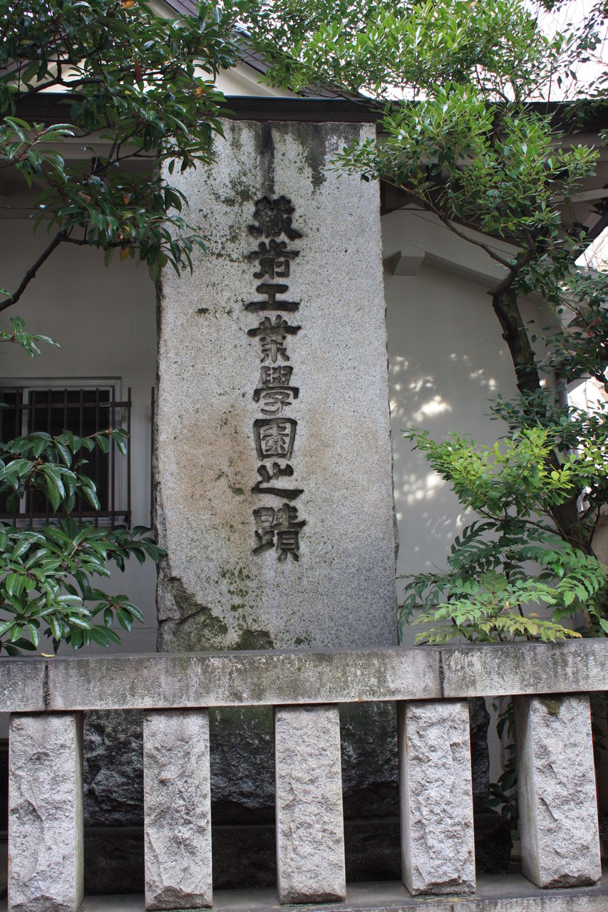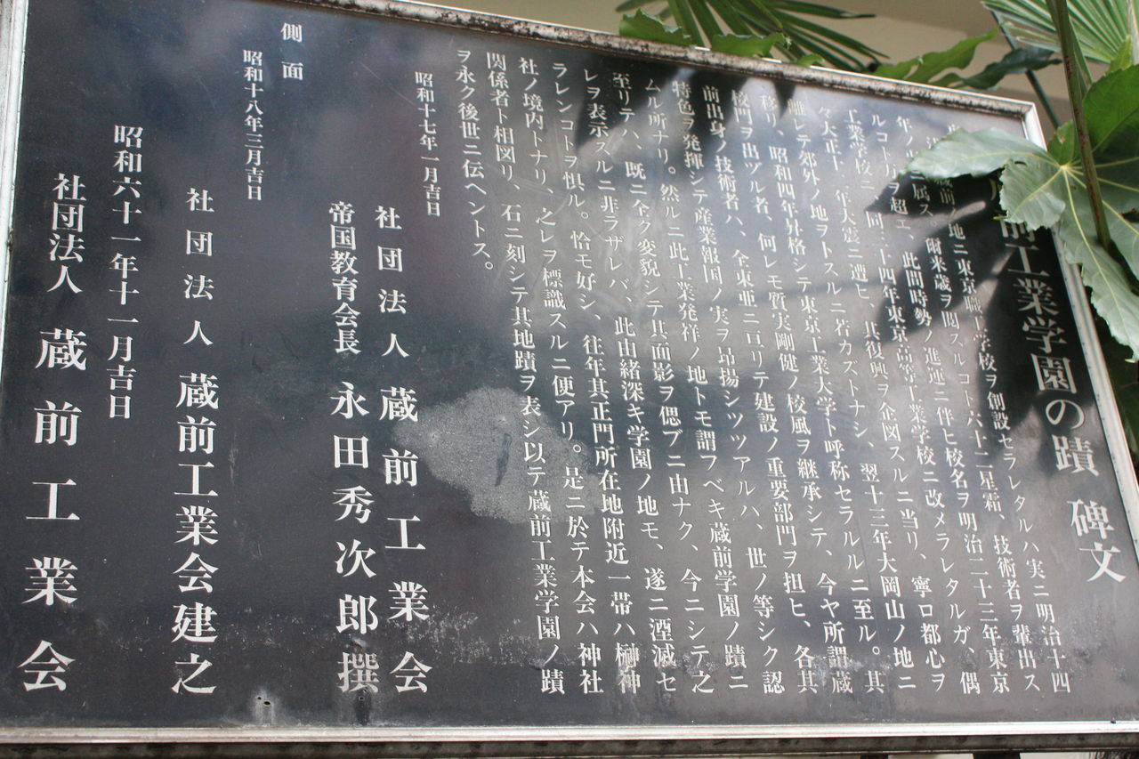 本石碑は、当地にあった東京高等学校工業学校(現・東京工業大学)を記念し、工業教育発祥の地として同窓会の蔵前工業会が建立したものである。